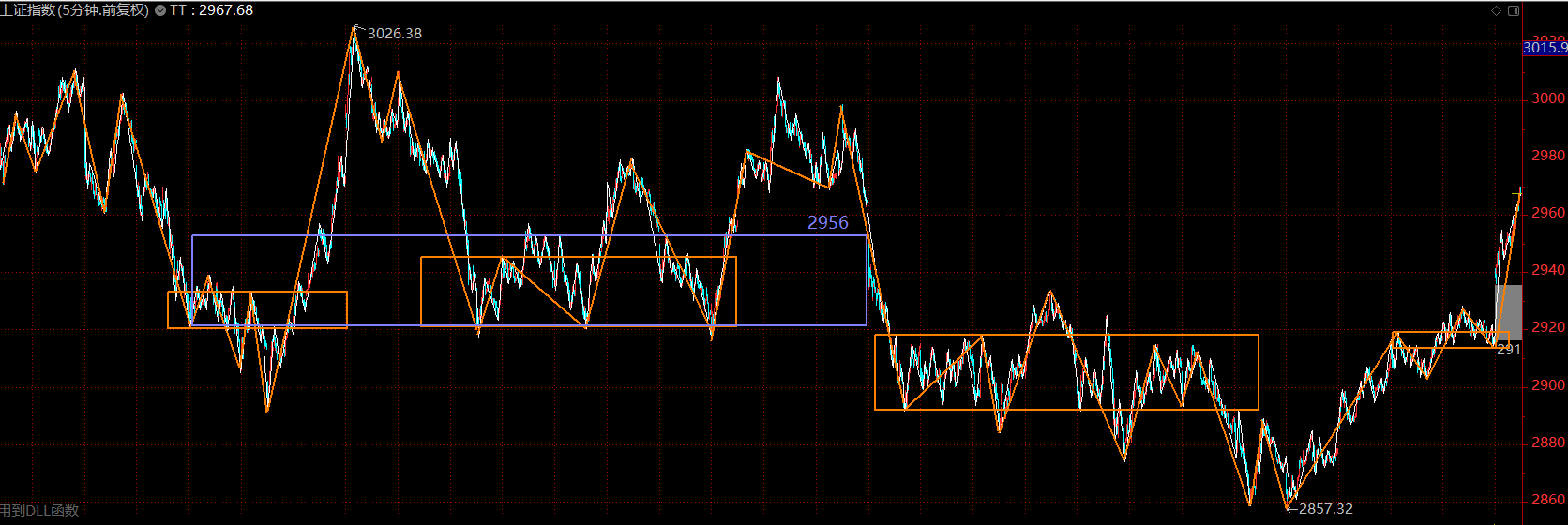 上周市场用前四天的时间,完成了这一轮五分钟上涨趋势的第一个中枢构建,是一个奔走型的中枢,随后在周五开始了主升阶段。值得欣喜的是,市场终于在2956这个大关口放量了,并且一举突破,预计在2956到3000点这40点的空间内,市场将会完成五分钟上涨第二个中枢的构建,并且横盘将其扩展为30分钟级别,时间周期大约是极点出现后的10到15个交易日。这将是投资者积极调仓换股,耐心布局年报行情的最佳时期。