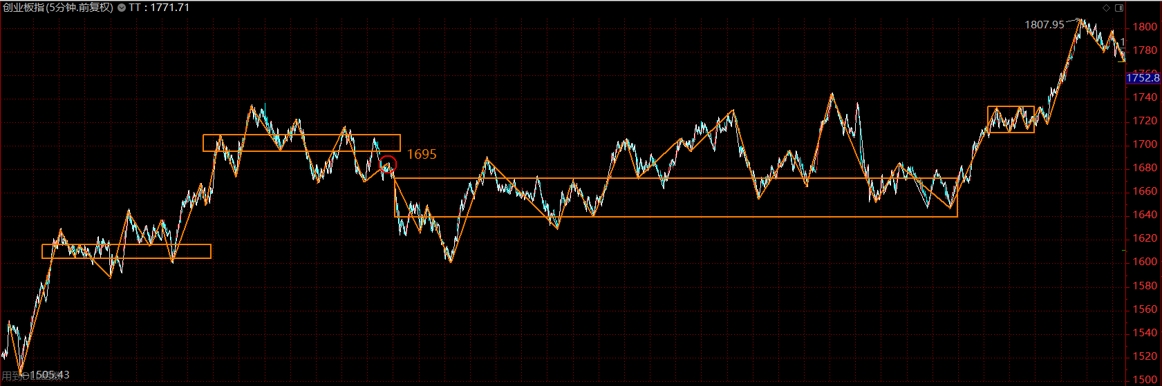目前分析只需集中于这个五分钟的上涨趋势即可,上周如期做出了五分钟上涨趋势第二个中枢的雏形。前面几天表现其实蛮超预期的,特别是科技股的逼空,A股似乎许久未见了。核心问题出在周五,周五有两个点显示出当下市场的外强中干,第一个在于周五早盘南京证券反包涨停时,市场资金的失衡,明显看出科技股与券商股两台“抽水机”从前几天的互相配合变成了互相伤害;这一段跳水直接将图形破坏,强度大的新高背驰可以说已经没有了,那下午上拉无力后的跳水也就在情理之中。