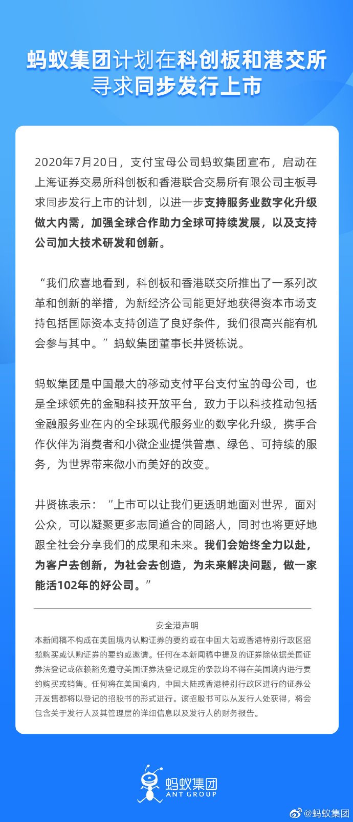 2020年7月20日下午,支付宝母公司蚂蚁集团在官方微博宣布,该集团计划在科创板和港交所寻求同步发行上市。