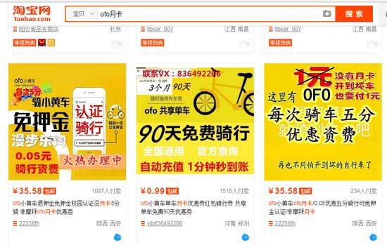 人民网IT频道记者在调查中发现,在摩拜和ofo的月卡涨价5-10倍的同时,两家公司大量的高折扣优惠卡却转移到淘宝等电商平台公开出售,在淘宝上输入“摩拜月卡”、“ofo月卡”则出现了大批免押金、8.8元包月、9.99元包月、0.05元骑行资费的广告,这些高折扣的优惠卡从何而来,却是一个谜。
