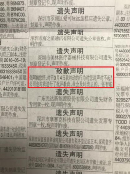 在3月24日的报纸上,记者在整版密密麻麻的分类信息中,终于找到了埋藏在其中的一条“致歉声明”——“张阿姨您好,对于3月4日我冲动的行为对您说声对不起!公司也对我进行了批评教育,我会及时改正的。”记者联系该版服务热线,对方表示登报这则致歉声明的价格为200元左右。(田志强)