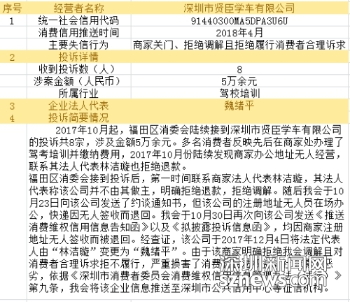 2017年10月起,福田区消委会陆续接到深圳市贤臣学车有限公司的投诉共8宗,涉及金额5万余元。多名消费者反映先后在商家处办理了驾考培训并缴纳费用,2017年10月份陆续发现商家办公地址无人经营,联系其法人代表林洁璇也拒绝退款。