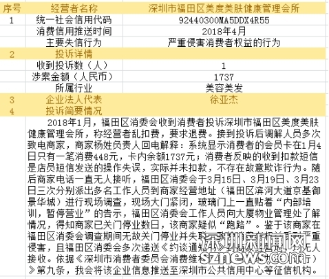 2018年1月,福田区消委会收到消费者投诉深圳市福田区美度美肤健康管理会所,称经营者乱扣费,要求退回余额(会员卡余额1737元)。接到投诉后调解人员多次致电商家,商家杨姓负责人回电解释:系统显示消费者的会员卡在1月4日只有一笔消费448元,卡内余额1737元;消费者反映的收到扣款短信是店员短信发送的操作失误,实际并未扣款,不存在故意欺诈行为。随后商家电话一直无人接听,福田区消委会于3月15日、3月19日、3月23日三次分别派出多名工作人员到商家经营地址(福田区滨河大道京基御景华城)进行现场调查,现场大门紧闭,玻璃门上一直贴着“内部培训,暂停营业”的告示,福田区消委会工作人员向大厦物业管理处了解情况,得知商家已关门停业数日,该商家疑似“跑路”。鉴于该商家在福田区消委会调查期间无故关门停业并失联,致使消费者权益受到严重侵害,且福田区消委会多次递送《约谈通知书》到商家经营地,均无人接收。依据《深圳市消费者委员会消费维权信用信息管理办法(试行)》第九条,我会将该企业信息推送至深圳市公共信用中心等征信机构。