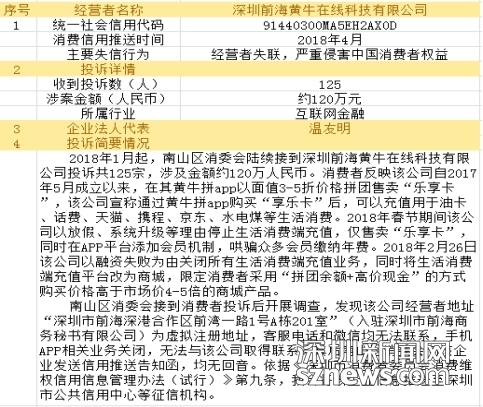 2018年1月起,南山区消委会陆续接到深圳前海黄牛在线科技有限公司投诉共125宗,涉及金额约120万人民币。消费者反映该公司自2017年5月成立以来,在其黄牛拼app以面值3-5折价格拼团售卖“乐享卡”,该公司宣称通过黄牛拼app购买“享乐卡”后,可以用该卡充值油卡、话费、天猫、携程、京东、水电煤等生活消费。最初消费者购买的“乐享卡”可正常用于生活消费端充值,直至2018年春节期间该公司以放假、系统升级等理由停止生活消费端充值,仅售卖“乐享卡”,同时在APP平台添加会员机制,哄骗众多会员缴纳年费。2018年2月26日该公司以融资失败为由关闭所有生活消费端充值业务,同时将生活消费端充值平台改为商城,限定消费者采用“拼团余额+高价现金”的方式购买价格高于市场价4-5倍的商城产品。