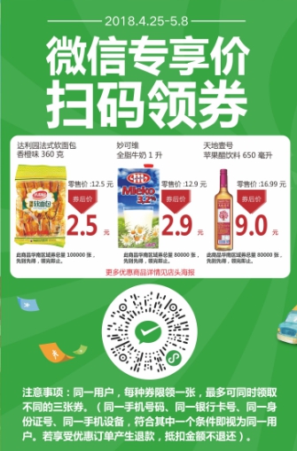 4月25日-5月8日期间在华润万家深圳市、广州市大卖场使用微信支付后有机会获得5张5元全场礼金券礼包,