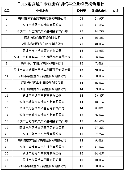 此外,为了全面展示深圳市汽车行业消费投诉状况,深圳消委会同时公布《“315消费通”未注册深圳汽车企业消费投诉排行》。