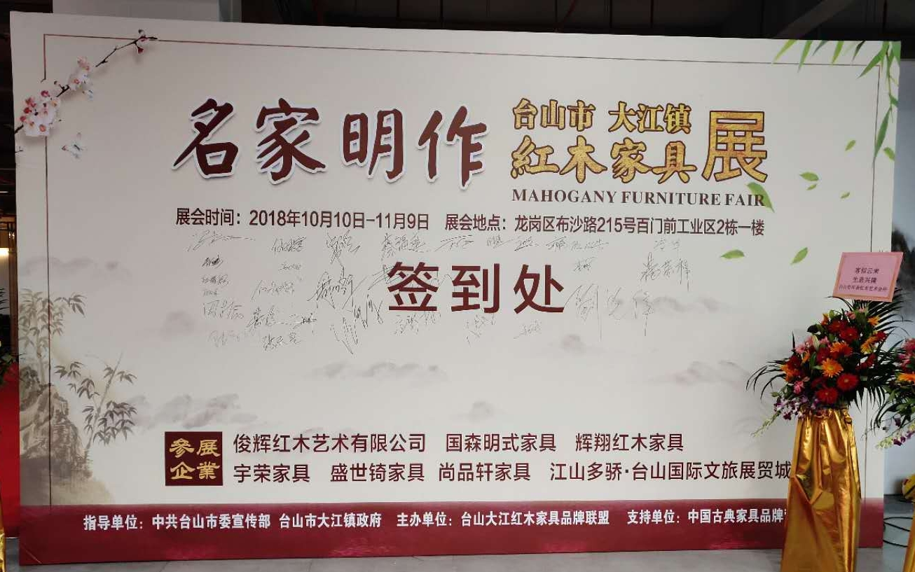 据了解,此次活动参展企业有:俊辉红木艺术有限公司,国森明式家具,辉翔红木家具,宇荣家具,盛世锜家具,尚品轩家具,江山多骄·台山国际文旅展贸城,活动时间:2018年10月10日-11月09日。