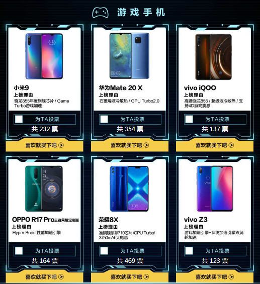 而游戏手机候选产品则包括:小米9、华为Mate20 X、vivo iQOO、OPPO R17 Pro王者荣耀定制版、荣耀8X、vivo Z3六强争霸,同样截至3月12日,第一天的投票中,荣耀8X脱颖而出,暂时领先。