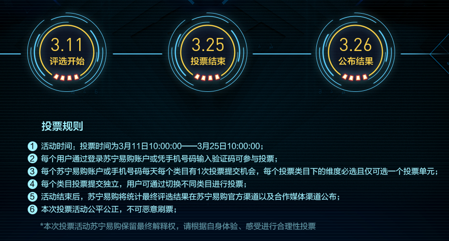 3月11日用户投票评选开始,3月25日投票结束,26日正式公布投票结果,活动贯穿苏宁易购315全民焕新节期间,面对众多手机、电脑、数码新品,用户会作何选择?