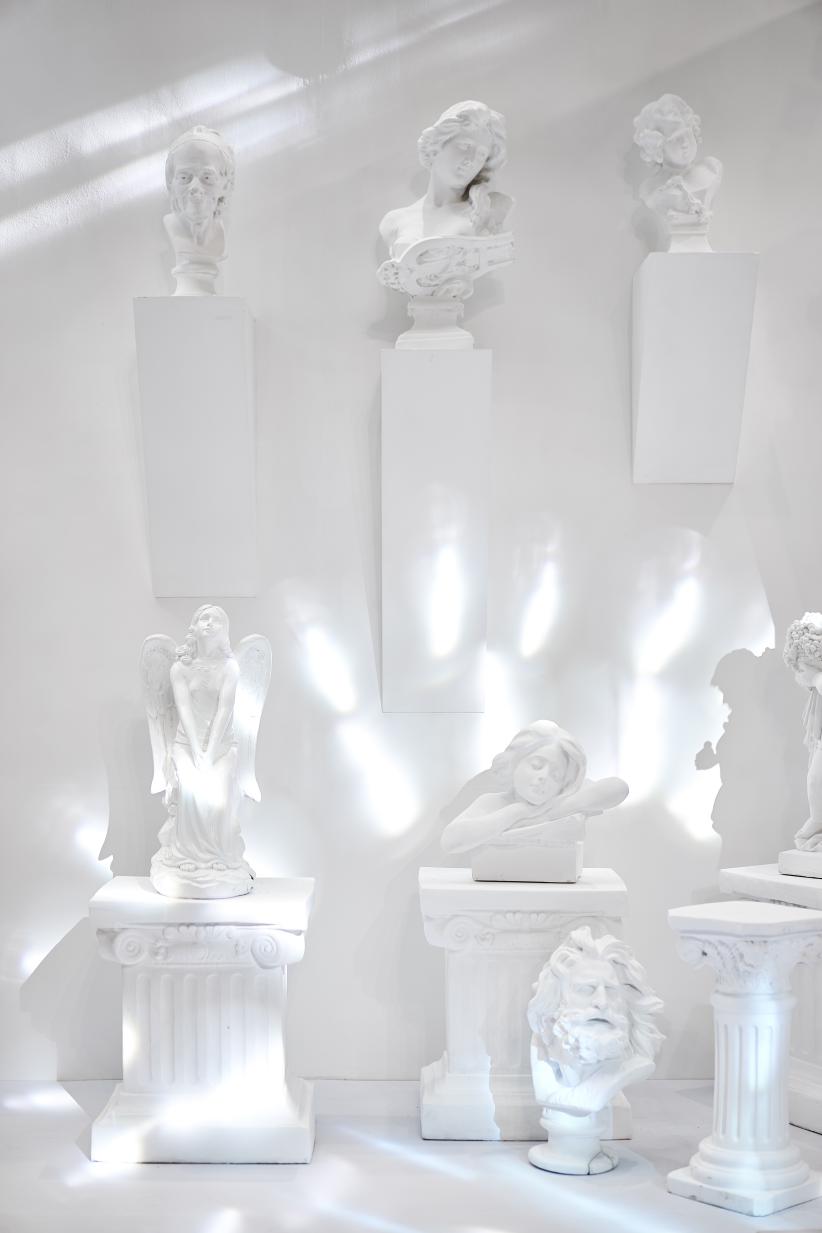 爱之全体验静态艺术展分为四个区域,分别对应 C-L-A-F(克拉时刻的英文),C对应白色区域,代表 C lassic(经典 ),在“C lassic”的区域中,洛杉矶郡艺术博物馆标志地标-灯柱( Urban Light)与文艺复兴的石膏像相结合,打造一片纯净又不失时尚的打卡区域。L对应红色区域,代表Love(爱),设计了以“心电感应”的一堵墙面,描绘遇到“爱情”的场景,从“正常”的心电图到遇见“爱”的怦怦心跳,纯红色的背景是打卡拍照的最佳地点。 A对应蓝色区域,代表Aftertaste(回味),整体背景运用国际克莱因蓝,形成撞色的冲击感。利用香水瓶,打造了一个蓝色的“气味收藏室”。F对应黑色区域,代表Forever(永恒),运用霓虹灯管打造神秘时尚的氛围,就像钻石一样在黑暗中闪烁,黑色背景成为许多人打卡点,仿佛电影桥段般的文字设计,非常适合还原电影场景。