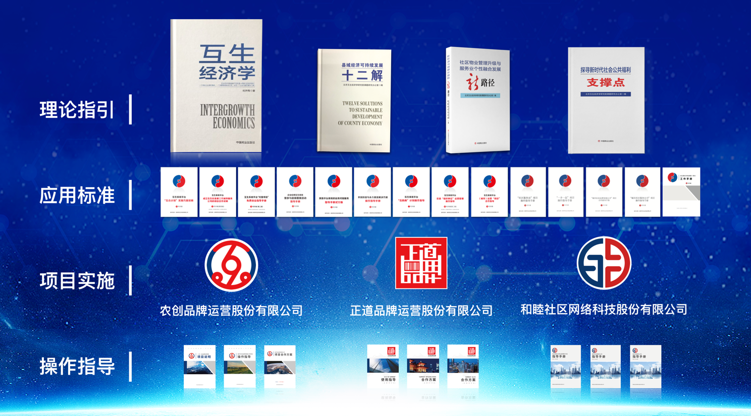 和睦社区网络科技股份有限公司以以《社区物业管理升级与服务业个性融合发展新路径》为理论指导,面向8万社区,致力于为房地产开发商转型,为物业管理公司提供升级服务,为社区居民提供创业就业机会,发展周边服务业产业链;正道品牌运营股份有限公司综合运用了几个方面的理论研究成果,推出了厂家直供渠道,搭建可溯源的分享代理销售新模式,为企业的品牌产品争取市场定价权,掌握市场主动权,建立正道品牌渠道运营管理体系,全面提升品牌企业及其产品的知名度,杜绝假冒伪劣产品,为品牌企业保驾护航,为创业者轻松创业提供路径。