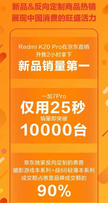 Redmi K20 Pro特地选择在京东618期间首销,其中还针对京东的用户推出了京东独家版本,而Redmi K20 Pro的整体销售成绩也表现不俗,在开售2小时就拿下新品销量第一;而在京东618期间推出的一加7Pro,仅用了25秒就销售上万部。