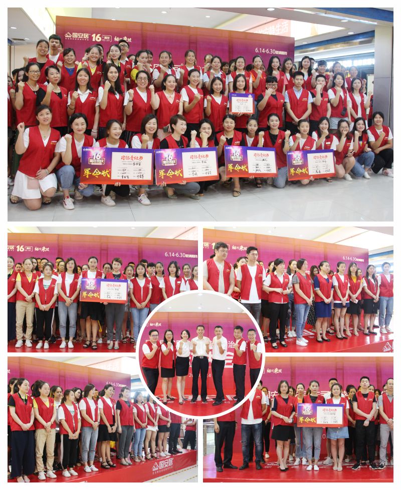 此次誓师大会作为“司庆大促”的启动引擎,极大地点燃了参与者的热情与激情。庄严的誓师大会上,来自深惠各大门店的全体方阵队员高举队旗,高喊口号,将现场气氛推向高潮,品牌代表们纷纷上台发言,几百家建材家具品牌集结成了猛虎、猎豹、雄狮、雪豹、等等团队方阵,登场亮相,高呼团队口号,并且当场签署了司庆大惠的军令状,并从各商场总经理的手中接过了团队军旗,这将预示着“国安居16周年司庆”定将以卓越的佳绩,再创销售的新高!