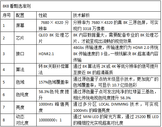 在行业趋势及国家政策的双重推动下,为正确引导8K电视市场发展方向、加快发展步伐,TCL联合国家广播电视产品质量监督检验中心经过长时间的市场调研及总结,从行业整体的角度对8K电视进行了初步探讨,并编制出《8K8看甄选白皮书》。这份白皮书告诉我们,实现真正的8K震撼视觉体验关键性能/技术要求如下。