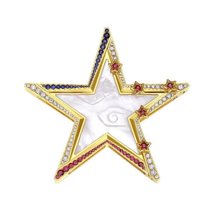 作为本次发布会主角,周大福17916系列新品“宸”曾作为第11届“法国圣埃蒂安国际设计双年展”参展作品,在世界舞台上绽放过光芒。“五角星”的造型融入了法国国旗蓝、白、红三色和中国国旗的五角星元素,代表了中法两国的交流与合作,双方希望通过宸这样意义深远的产品,见证和促进两国的和平发展与经济交流。“宸”以北极星为灵感来源,寓意点亮年轻人的生活与梦想。别具一格的五角星设计艺术感十足,钻石与22K金的加持,更让整个作品展现出夺目光彩。白贝母项链外圈围以钻石、宝石,一款三戴,幻化无限魅力。简洁的五角星造型,干净有力,犹如夜空中指引前行的明星。