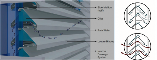 除了屋面幕墙的“防水神经系统”,令人惊叹的还有安装在展馆立面幕墙上的“人字形”百叶,这种双片百叶同时具备50%“空气通风性能和95%防雨水性能。巧妙的“人字形”设计,使得风和雨水从百叶片间进入时,能够保证空气从向上倾斜的第一片百叶有效进入,而雨水被第二片向下倾斜的百叶挡住,并由叶片分流至两边的竖框里,排出下边框。“人字形”百叶不仅能完全阻风防雨,还具备超高强度,足以抵抗台风暴雨的侵袭。