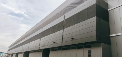 除了多种巧妙的防水设计之外,项目幕墙组还在本身就具备防水性能的所有铝板和室外可视型材上进行了厚度不小于45微米的氟碳喷涂处理三涂,专门为这座超级展馆增加一层防蚀护甲。