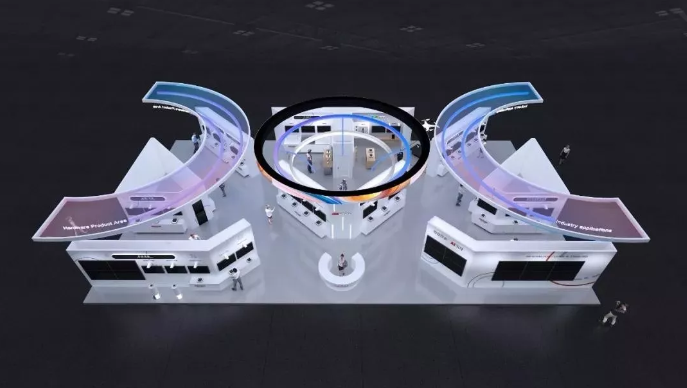 展台的吊顶设计以“COC”形状为主体,引发读者众多猜想,包括“CloudOFCity城市之云”、“AICloud三级架构”、“物信融合”、“CalculateOnCloud”等。