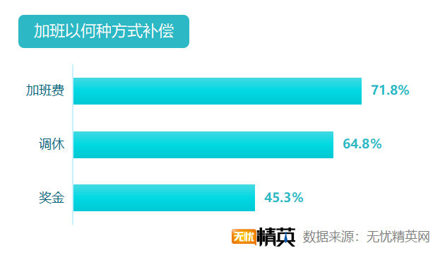 几乎所有双11加班的职场精英都能获加班补偿,更有31.4%人能获得两项或更多的补偿。71.8%的职场精英可以获得加班费;64.8%的人获得调休;45.3%的人会获得额外的奖金。
