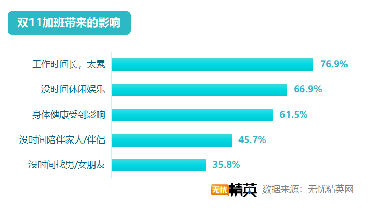 双11高强度的加班,导致职场精英们的生活受到较大影响,76.9 %的人因为工作时间过长,觉得太累;66.9 %的人因为加班没有时间休闲娱乐;61.5 %的人身体健康带来影响;45.7 %的人没时间陪伴家人/伴侣;更有35.8 %的人,将没有男朋友/女朋友的锅,扣到了双11的头上。