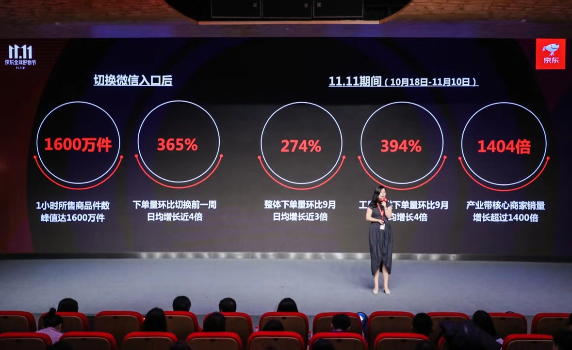在京喜11.11期间(数据从10月18日截止至11月10日),整体下单量环比9月日均增长274%,工厂直供下单量环比9月日均增长394%,产业带核心厂商订单量提升1404倍。