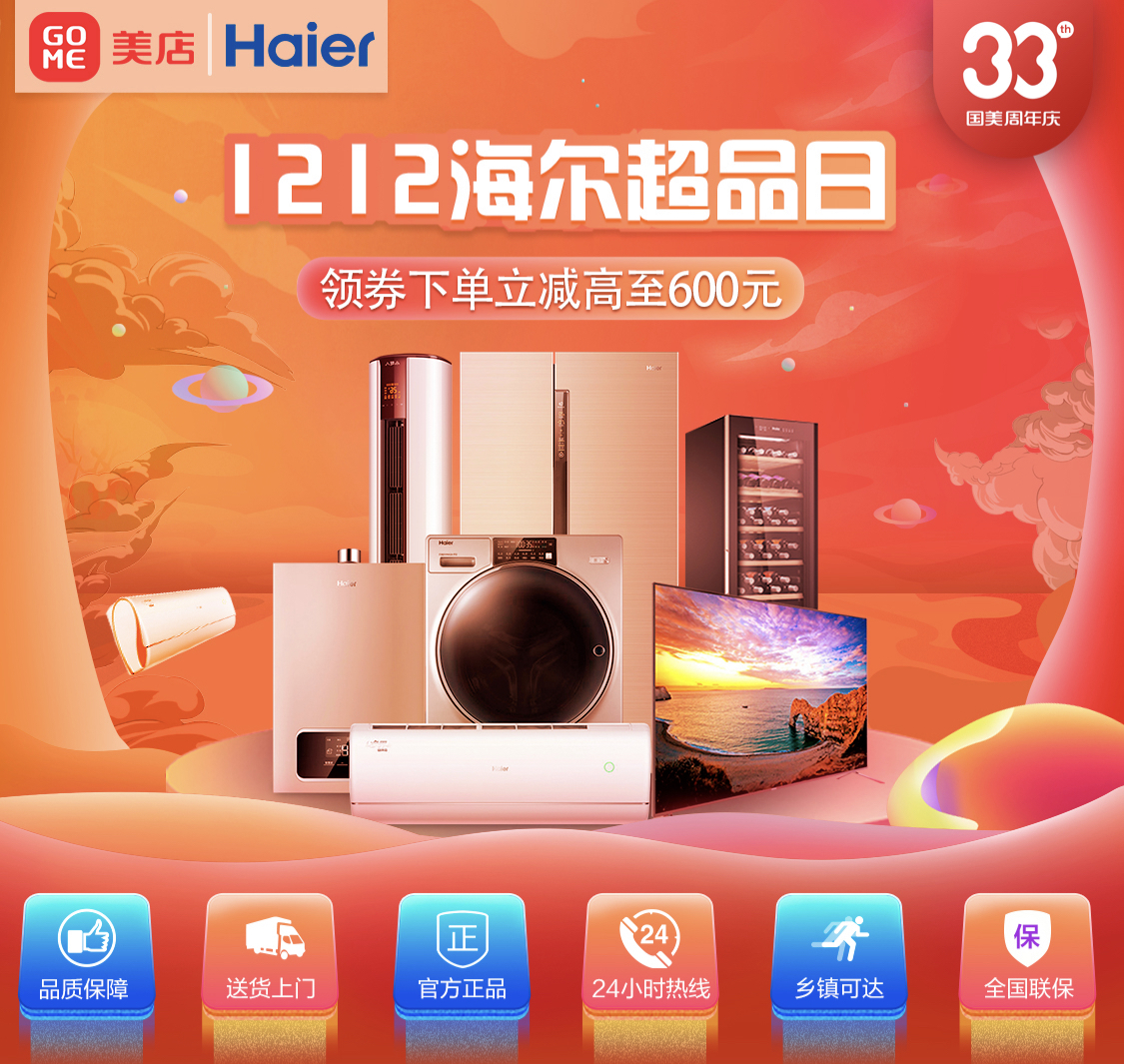 12月12日-15日,33周年生日之际,国美与海尔再度携手,国美美店带来海尔超级品牌日活动,涵盖了海尔冰箱、洗衣机、空调、电视、厨房卫浴等多个品类丰富产品,多重优惠福利、六大承诺保障、延保清洗服务。