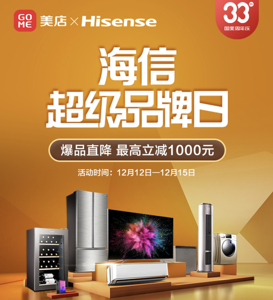 12月12日至15日期间,海信在国美美店推出超级品牌日活动,全场爆品直降,最高立减1000元。本次超品日期间,海信拿出数十款电视、冰箱、空调、洗衣机产品,给出高力度的优惠。其中多数产品为国美销售爆款,包括海信L5系列激光电视、VIDAA系列智能电视、海信旗下子品牌容声十字对开门冰箱BCD-452WSK1FPG、1.5匹变频空调KFR-35GW/A8X860N-A1、9公斤滚筒洗衣机XQG90-U1402FG等。