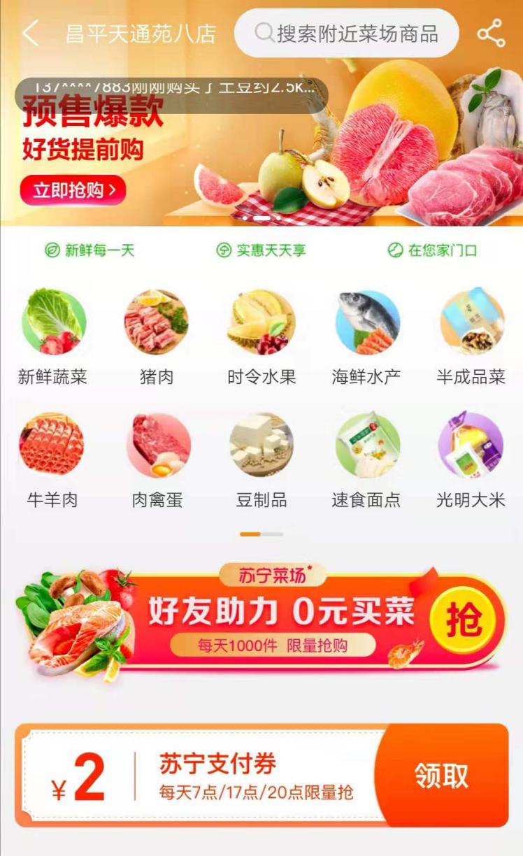 目前,苏宁菜场已覆盖东城、朝阳、丰台、石景山、海淀、顺义、通州、大兴、房山、门头沟、昌平、平谷、密云、怀柔共计14个市辖区,在当地上架商品SKU超200个,其中时令蔬菜占比达40%。