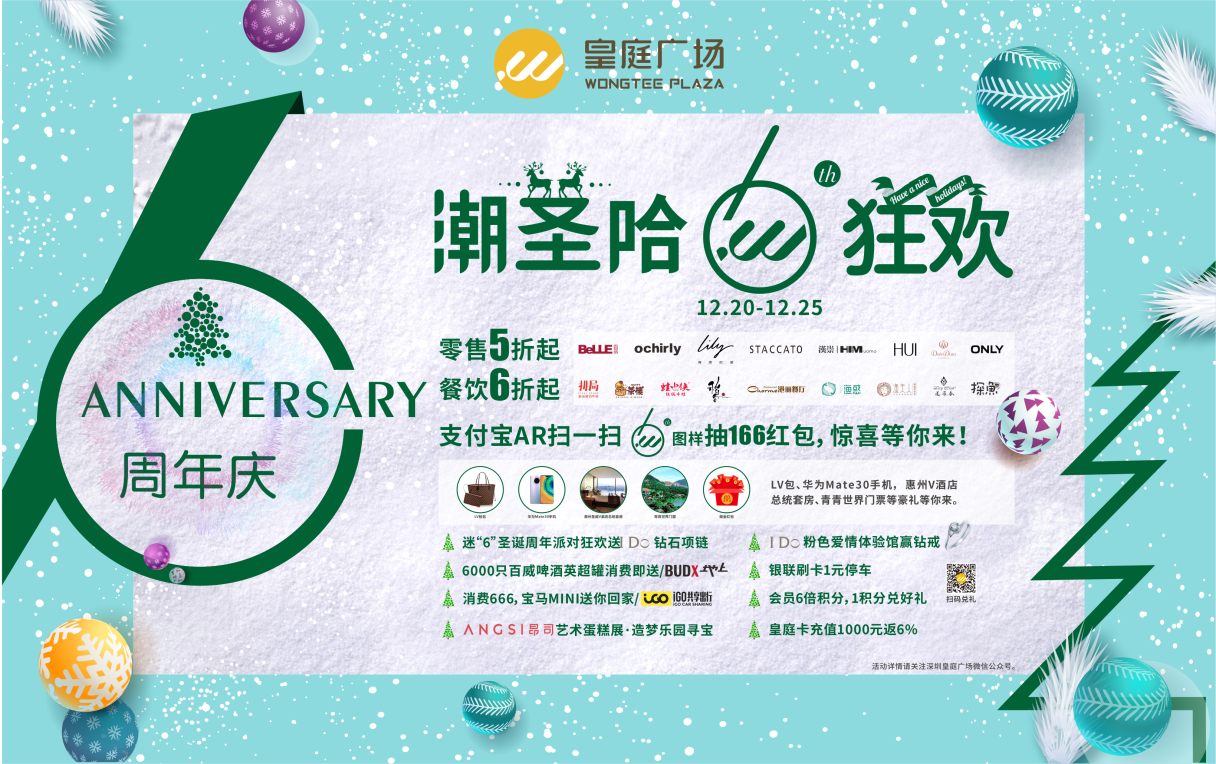 ‘潮’6周年圣诞梦幻SHOW:12月21日晚,深圳皇庭广场将迎来6周年派对暨圣诞美陈亮灯仪式,一场圣诞节与周年庆的狂欢party由此开启。现场将给消费者带来精彩纷呈的镜面人机械舞、潮圣街舞表演、梦幻音盒舞等精彩环节让人过足眼瘾;除此之外,项目集结场内多家潮牌带来的时装品牌秀更是让人耳目一新,现场参与互动环节还有机会获得万元神秘大奖。创意与潮流的碰撞、商业与时尚的完美融合,必将周年庆气氛推向高潮。