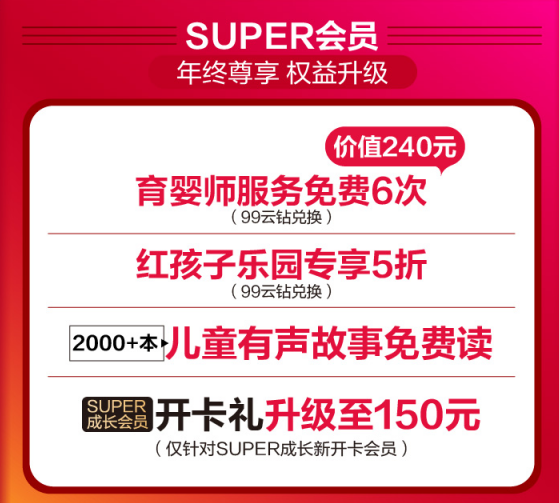 即日起,上苏宁易购参与苏宁红孩子“年终狂欢抢购盛典”活动,10点、15点、20点整点抢2019元母婴神券,进入苏宁拼购小程序最高可领取8元膨胀红包。全国近200家苏宁红孩子门店还推出满30元减30元神券限量砍,99云钻免费兑换育婴师服务、红孩子乐园5折优惠等。