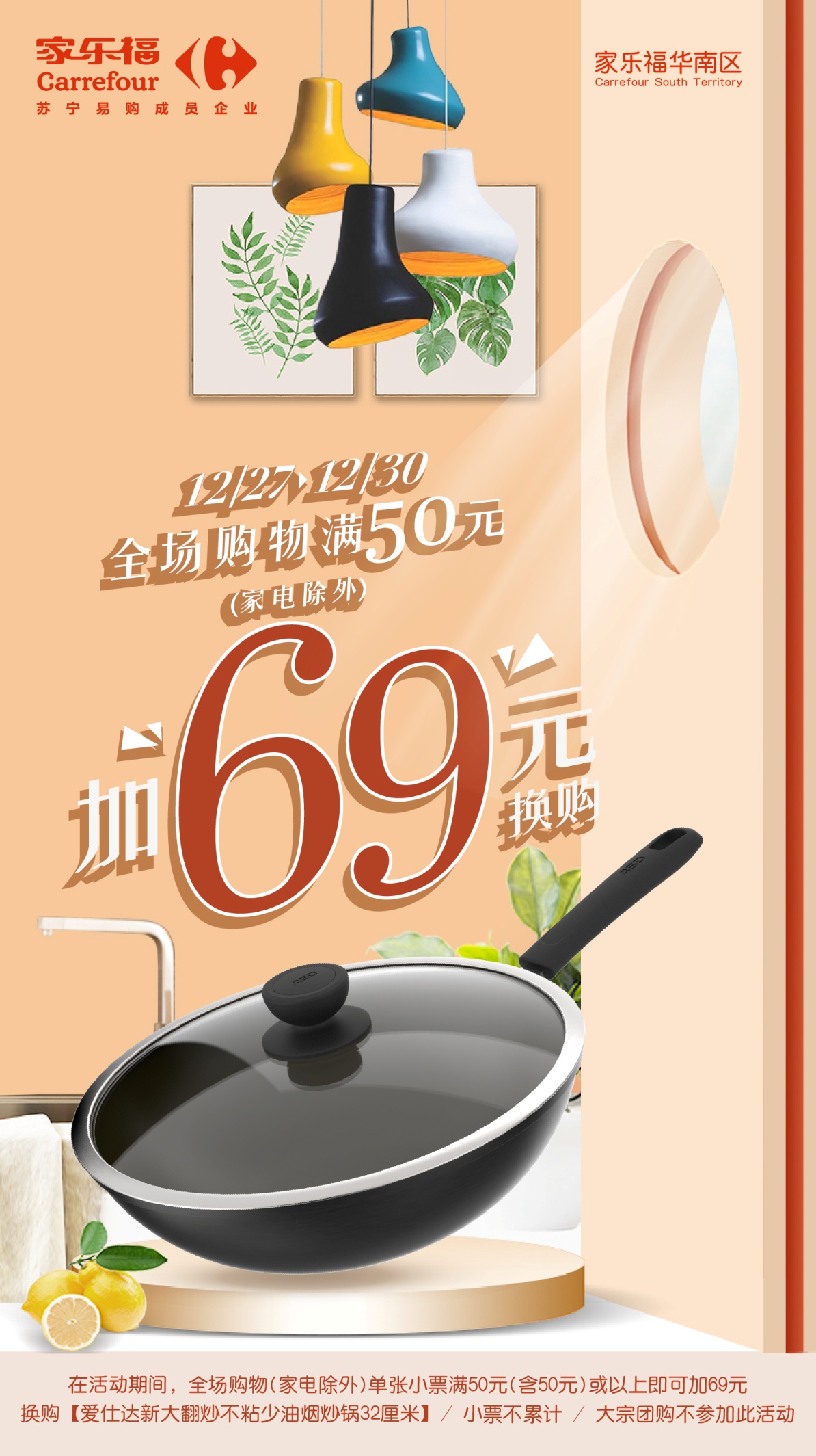 最后播报一则“笋盘”信息。12月27日至30日,顾客在家乐福华南区门店全场购物满50元,还可加69元换购爱仕达新大翻炒不粘少油烟炒锅32厘米(家电、大宗团购除外,小票不累计)。