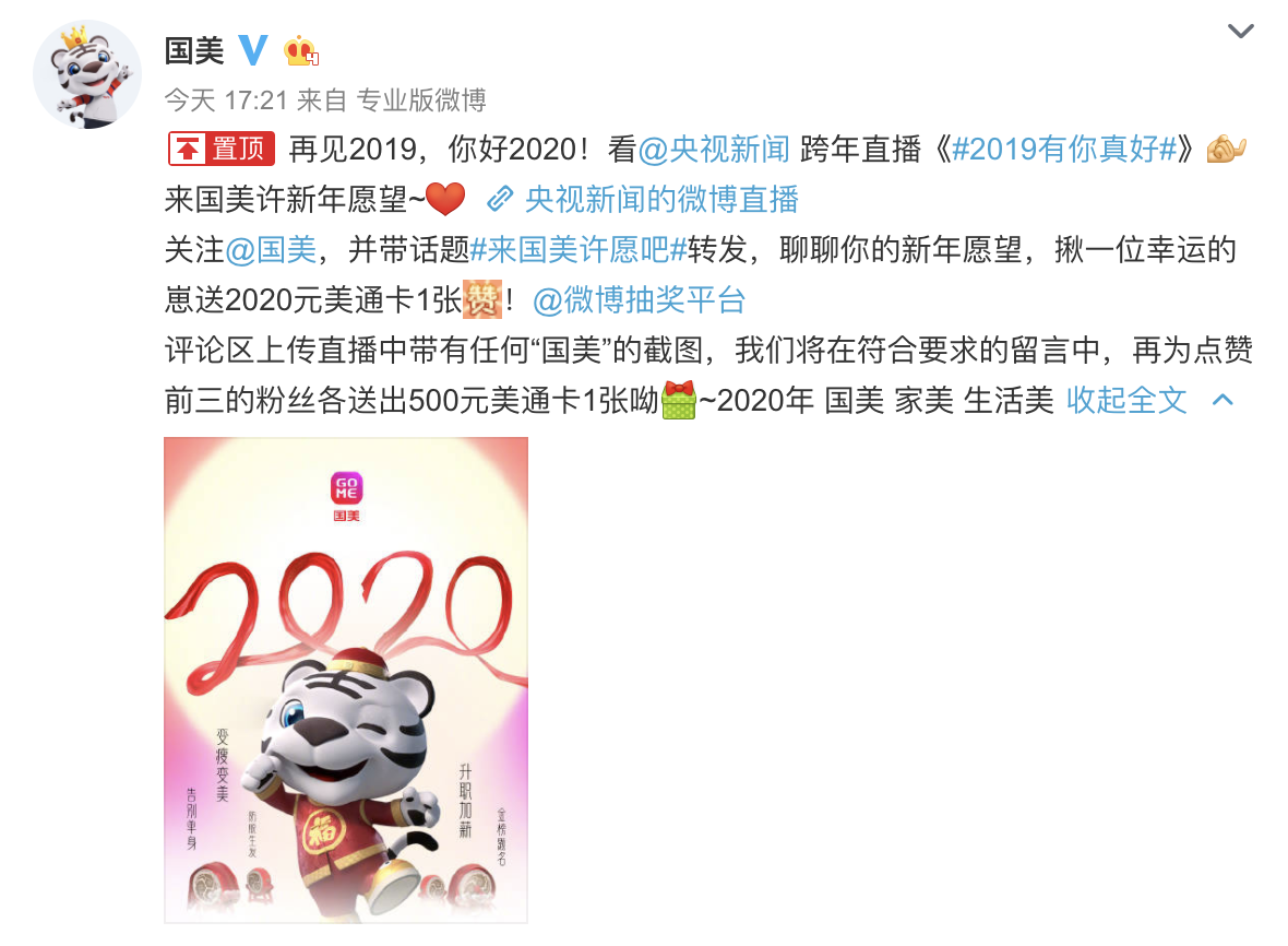 今年是国美首次联合央视新闻跨年直播,为实现广大国美用户的心愿,回馈消费者。国美还在微博启动多个有奖转发活动,奖品为面值200元、500元、2020元的国美美通卡,如果没有赶上央视新闻的跨年直播,还可在国美官方微博参与抽奖,新的一年有好的开始,没准下个锦鲤就是你!(常军平)