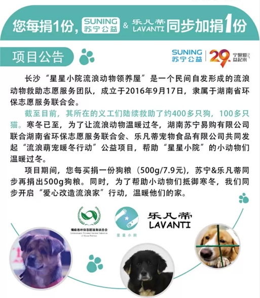 要说本次暖心活动最受关注的,还属苏宁线上线下联动发起的“爱心狗粮7.9元捐”活动。活动期间,爱心人士只需要以7.9元的折扣价,在苏宁易购线上购买一斤乐凡蒂狗粮就可完成捐赠。同时,苏宁和乐凡蒂将加捐1斤。相当于7.9元捐赠两斤狗粮。而这些爱心狗粮,将直接发往长沙“星星小院流浪动物领养屋”。