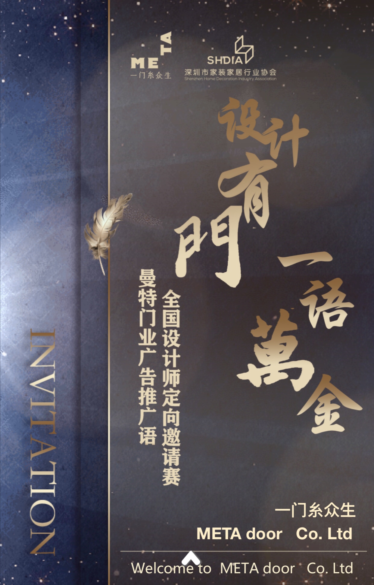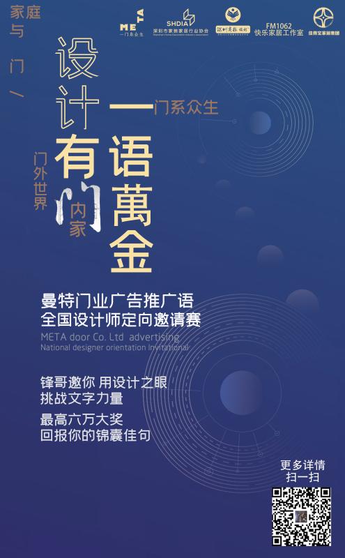 “设计有门,一语万金”深圳市家装家居行业协会、深圳商报、FM106.2《快乐家居》工作室联手曼特门业举办的曼特门业广告推广语全国设计师定向邀请赛,在2020年1月1日正式启动啦。