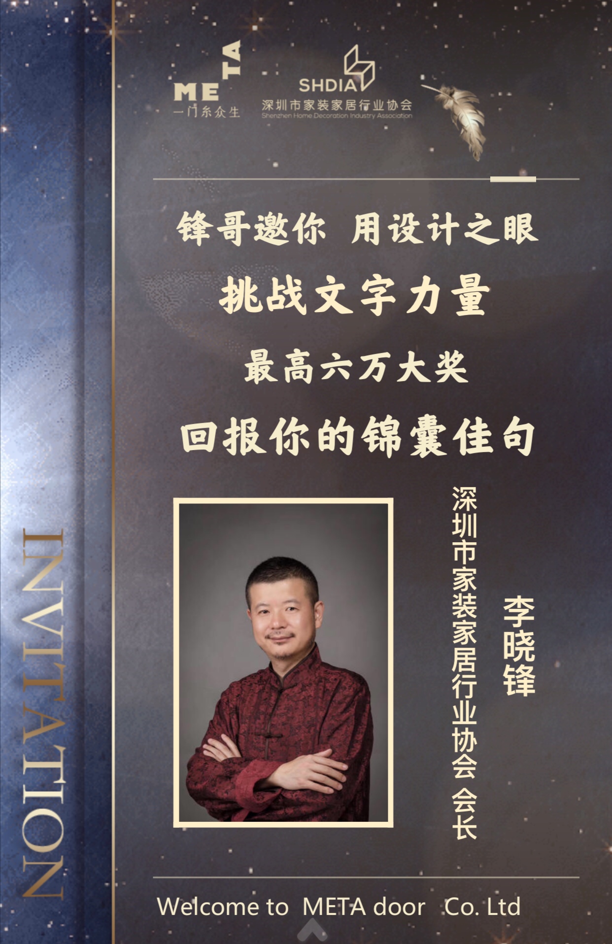 本次活动是深圳市家装家居行业协会继打造业内第一个门店设计邀请赛后,策划的又一件引起行业轰动的事情。深圳市家装家居行业协会李晓锋会长邀请全国家居设计师一起玩“跨”界——为曼特门业设计广告推广语。本次邀请赛也是业内首次面向设计师群体的推广语征集活动,曼特门业将用六万大奖回报设计师的锦囊佳句。