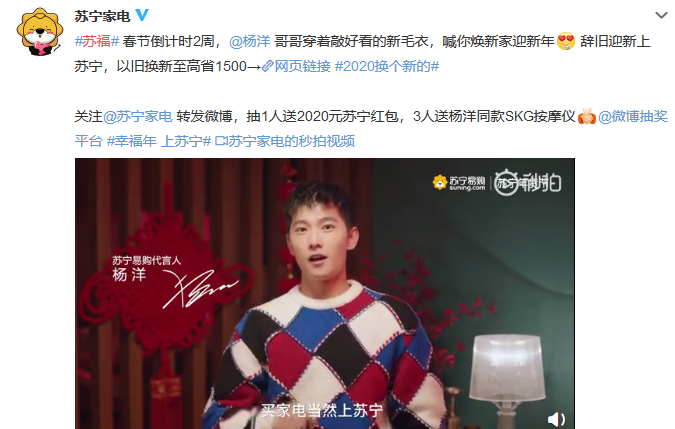苏宁代言人杨洋和江疏影也给大家带来了不少福利,粉丝们继续喊话爱豆,“过年就差一个杨洋了,万一实现了呢”。苏宁家电直接开启鼠运来袭模式,粉丝参与微博互动,就有机会获得2020元苏宁红包,还能获得杨洋同款SKG按摩仪。