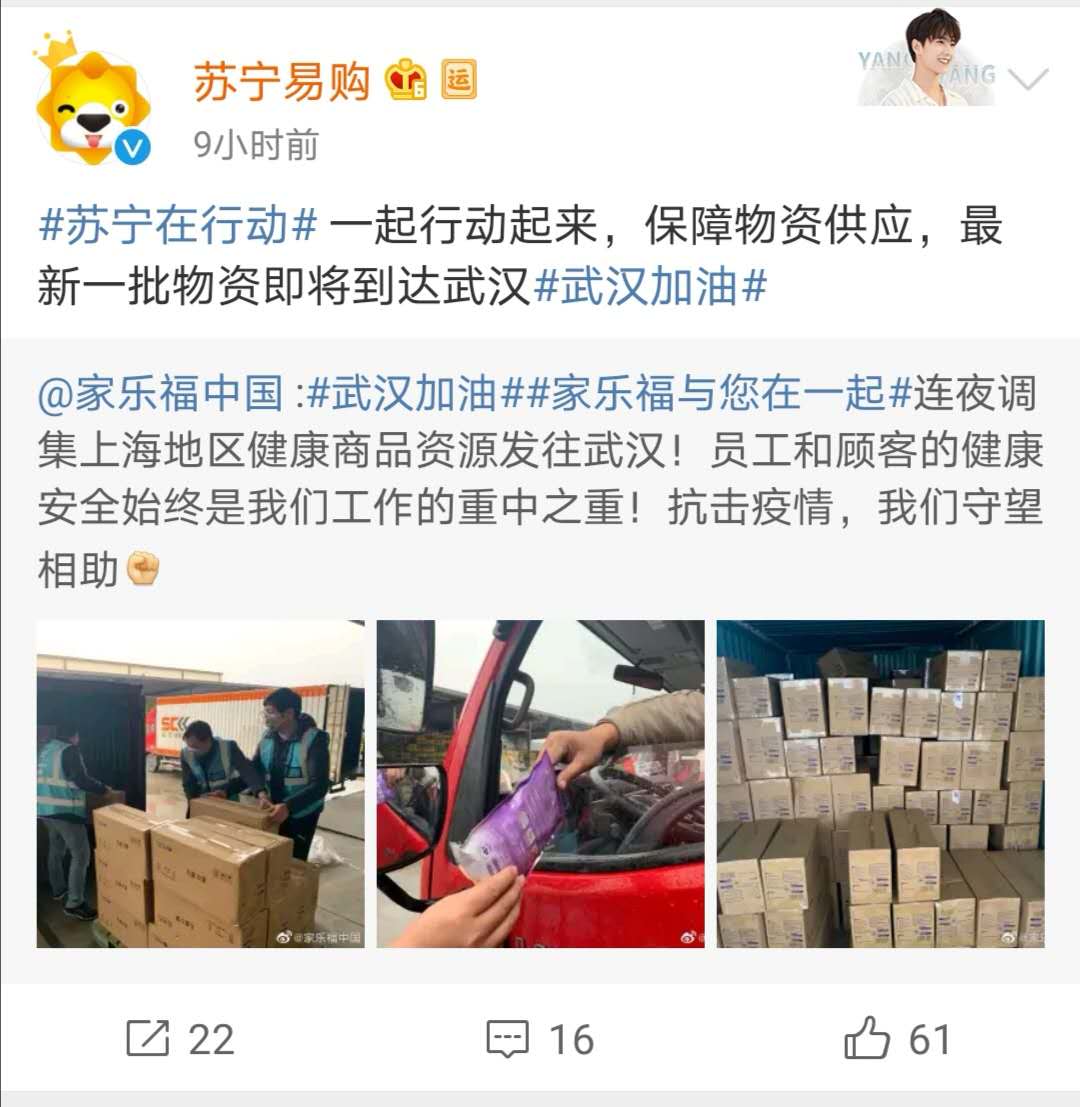 在疫情后方,不少后勤保障单位、组织也是做好了充足的准备。1月23日,苏宁旗下家乐福中国官方微博发布了一条关于 #家乐福坚决不涨价,亏钱也不能涨!#的微博表示,家乐福中国管理团队承诺春节期间民生用品不涨价,同时针对武汉及全国范围都提前备好充足货量,誓与全国人民一起共渡难关。