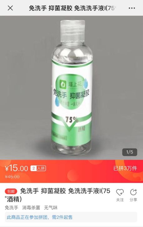 春节假期进入尾声后,有少部分工厂陆续复工。其中有一家来着于苏宁“拼工厂”的河北企业与苏宁拼购通力合作,开足马力,全力生产酒精含量为75%的免洗手抑菌凝胶。据苏宁拼购相关负责人介绍:“苏宁将根据最近疫情消费数据指导该‘拼工厂’生产,预估未来几天销量,让工厂效率达到最大。”据悉,该款“75%免洗手抑菌凝胶”商品仅2月2日上半日便拼出3万单。河北“拼工厂”负责人表示,目前产能能达到日均20万瓶。