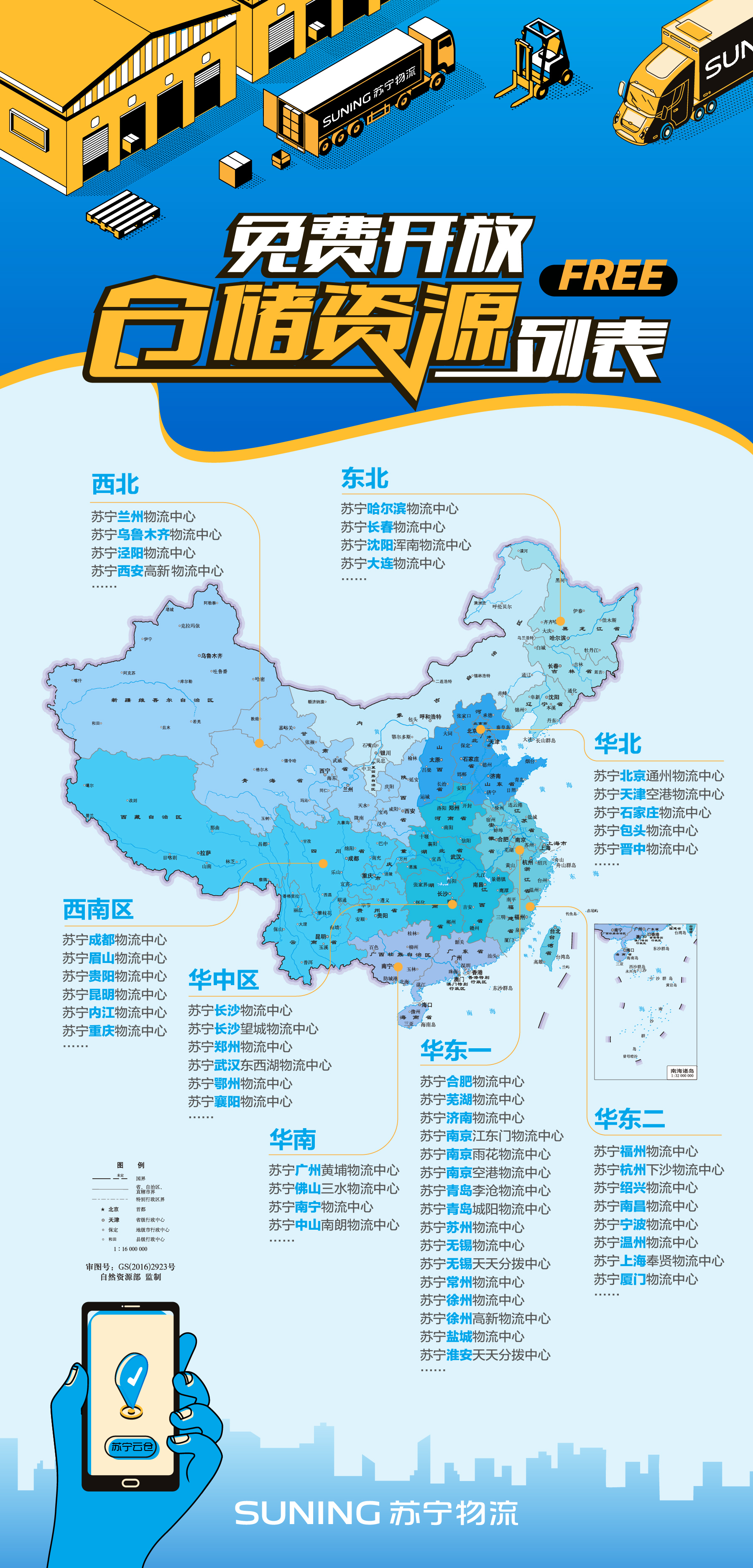 本次免费仓储资源涉及苏宁物流全国100+物流中心,涵盖北京、上海、广州、南京、成都、武汉、沈阳、西安、天津、温州、长沙、中山、佛山、徐州、青岛、哈尔滨等城市,可满足全国绝大多数地区的相关需求。