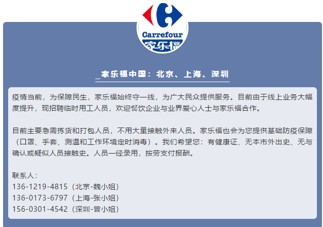 此外,家乐福还向全社会发出召集,以北京、上海、深圳为重点城市,希望社会暂时性歇业人员能够前来上岗,主要工作职责为线上业务的拣货、打包,不用大量接触外来人员。家乐福将提供快速上岗培训,包括个人安全卫生和防护、顾客服务和岗位技能培训,以及基础防疫保障。