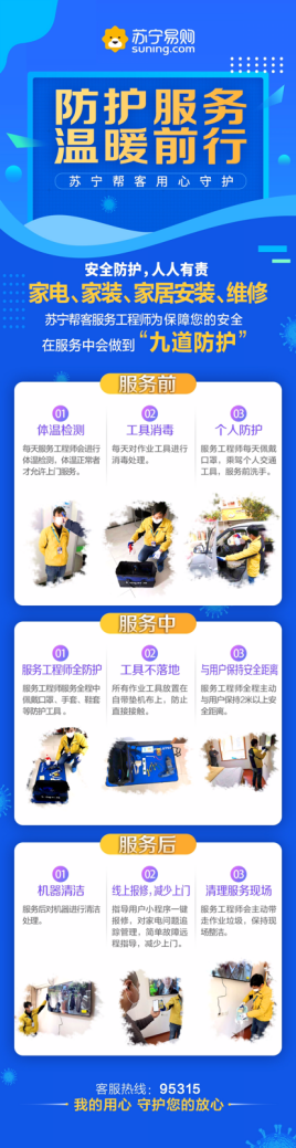 据悉,苏宁家电“九道防护”措施涵盖服务的前、中、后期全程。服务前,苏宁服务工程师需进行体温检测,衣物工具车辆消毒,同时佩戴口罩;服务过程中,需佩戴口罩、手套、鞋套等全套防护工具,并主动与用户保持2米的安全距离,避免直接接触;服务完成后,对机器进行清洁处理,同时指导用户关注报修和故障求助,带走作业垃圾。