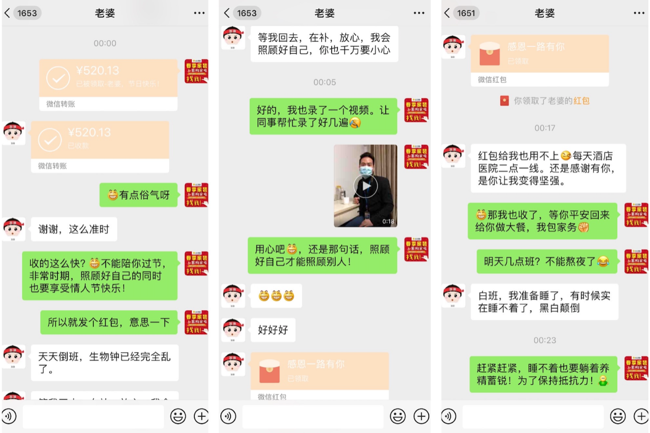 妻子也回赠了红包,说:“感谢有你,是你让我变得坚强。”尽管疫情让他们相隔千里,但爱情始终连接着彼此的心。