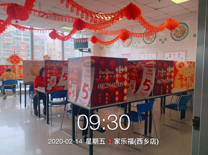 苏宁家乐福还安排了保洁员每天对员工餐厅按三餐进行清洁,使用稀释的84消毒液浸泡抹布对桌椅进行擦拭。其次,在餐厅放置免洗消毒凝胶,供员工用餐前清洁使用。再次,要求员工分时段用餐,自带餐盒餐具盛饭;每个人在餐厅内用餐是也要与他人保持一定距离,并用简易卡板隔开。