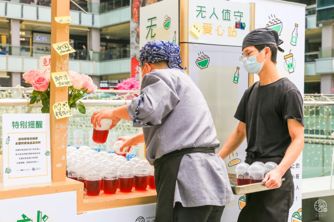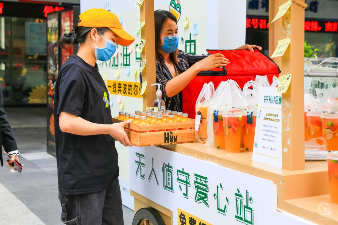 3月3日至3月8日卓悦INTOWN在街头专设了一个”无人值守爱心站”,用爱心餐车上放满了食物冷/热饮,专门免费赠送给快递、外卖小哥、环卫工人、警察、城管等一线奔波的人员。