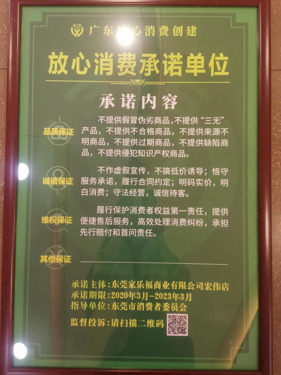 家乐福根据《经营者“放心消费承诺”活动规则(试行)》向社会公开作出品质保证、诚信保证和维权保证的“三大承诺”,承诺不提供假冒伪劣商品,不提供“三无”产品;不作虚假宣传;履行保护消费者权益第一责任等,充分发挥放心消费承诺单位示范作用,深入推进放心消费创建活动,深化消费维权社会协同共治,营造安全放心的消费环境。