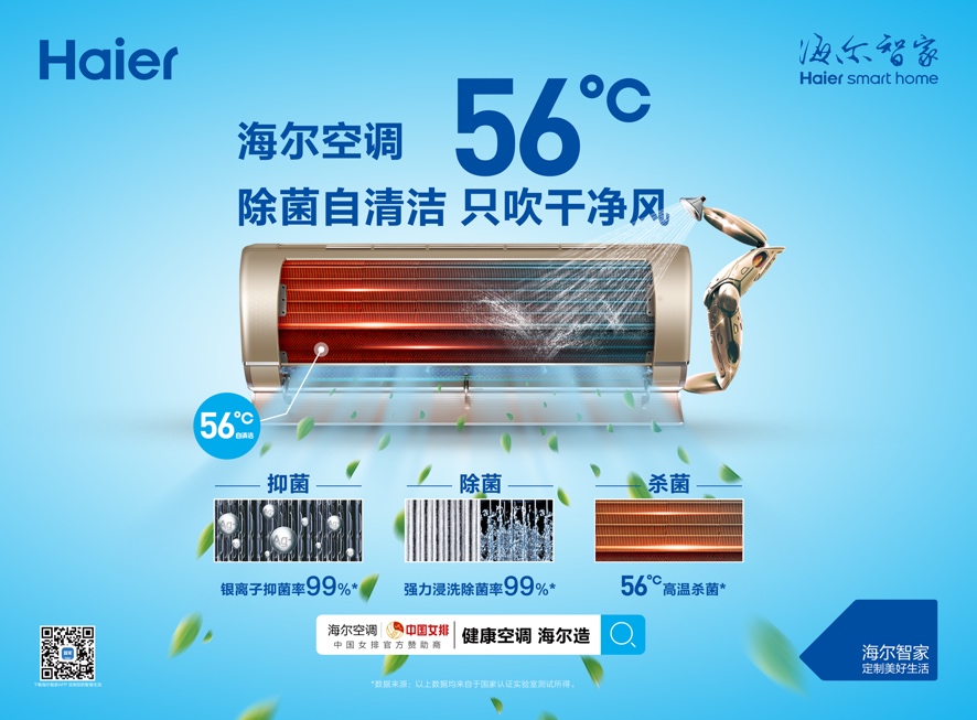 不仅如此,针对空调脏、清洗难的问题,海尔还升级了56度C除菌自清洁空调。当空调开启自清洁后,蒸发器温度可达56℃以上,达到除菌除尘的效果。