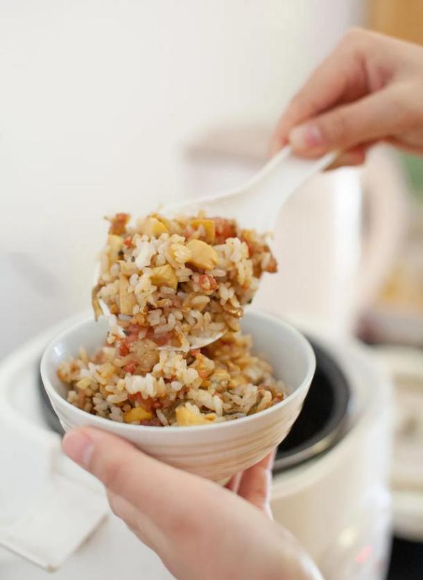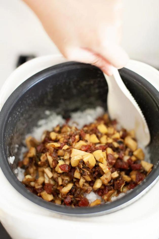 5.米饭煮熟后,把炒好的料倒入电饭煲中,翻拌均匀,再次盖上盖,用电饭煲保温焖10分钟。即可出锅享用啦。