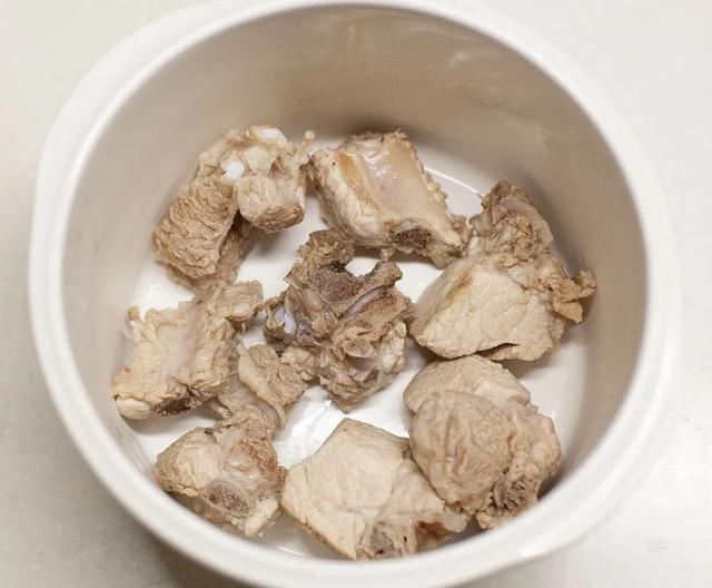 1.火腿、春笋切块;排骨、火腿冷水下锅,加两片姜焯水,洗净备用。