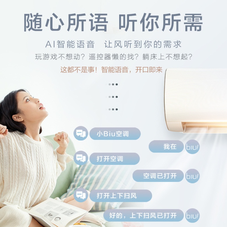 此外,小Biu空调Max搭载了AI智能语音控制技术,你只需要对它说“小Biu空调”将其唤醒,就能实现开机关机、模式切换、调节温度等操作,实现了真正的智能语音操控。同时,小Biu空调Max采用行业一流的海立压缩机,并具有高温自清洁、APP远程控制、急速冷暖等亮点功能,提供整机6年、压缩机10年保修的服务。