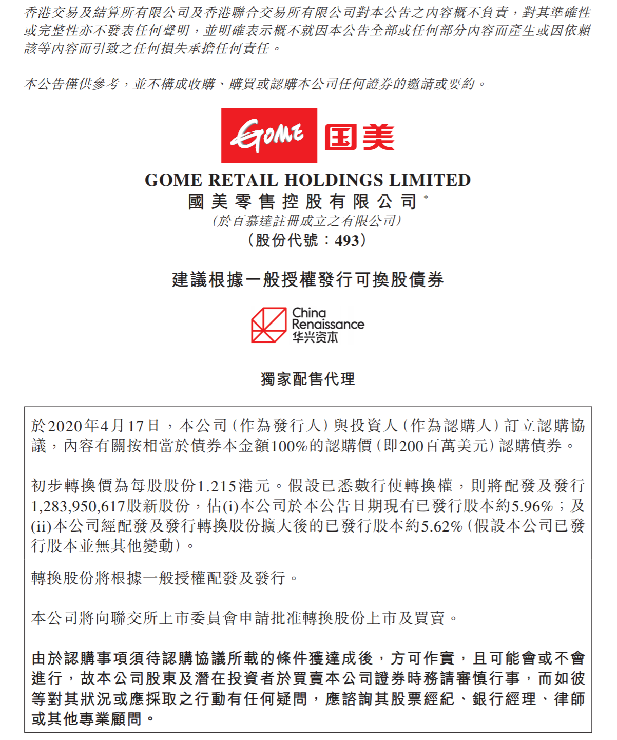 公告称,拼多多以总计2亿美金的可转换债券方式对国美进行战略投资。根据协议,初步股份转换价为每股1.215港元,分别较国美零售2020年4月17日收盘价及截至2020年4月16日前五个连续交易日之平均收盘价溢价66.44%及68.75%。